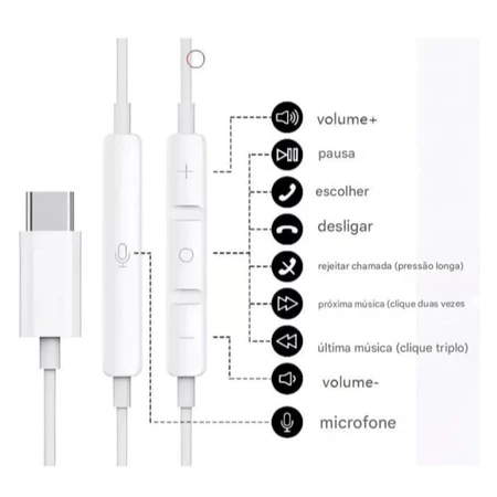 Fone de ouvido primeira linha Apple Tipo-C, com som estéreo, microfone integrado e controle no cabo. Compatível com iPhone com entrada USB-C, ideal para chamadas, músicas e uso diário com conexão estável e uso imediato.